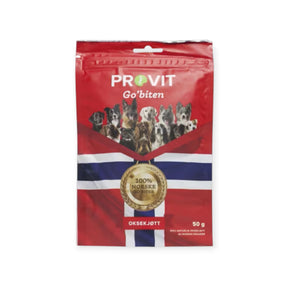 Provit Go’biten Oksekjøtt er en smakfull og sunn hundegodbit laget av 100 % norsk oksekjøtt, helt uten tilsetninger. Frysetørkingen bevarer smak, næringsstoffer, vitaminer og mineraler – slik at hunden din får en naturlig og trygg belønning.